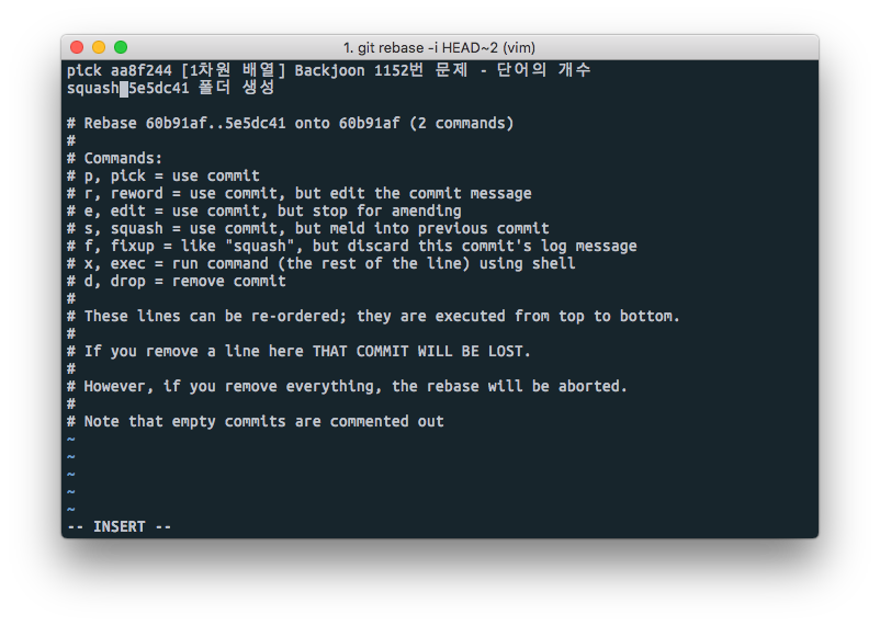 나타난 커밋들 중에 합치고 싶은 커밋의 pick을 squash로 변경한다.