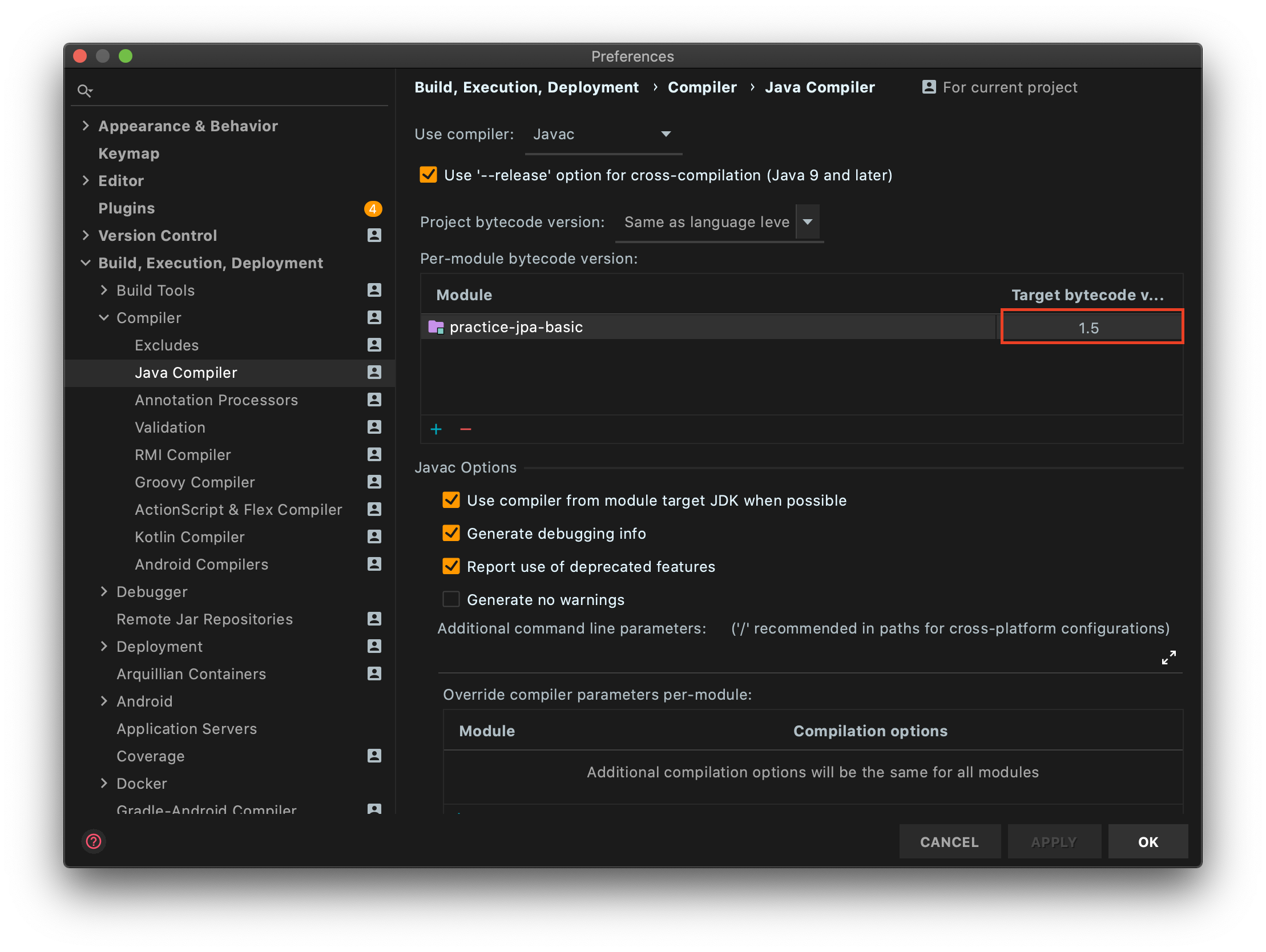 - Preference > Build, Execution, Deployment > Compiler > Java Compiler 메뉴에 들어가 해당 모듈의 타겟 버전을 default 인 1.5버전을 클릭해 원하는 버전으로 변경해준다.